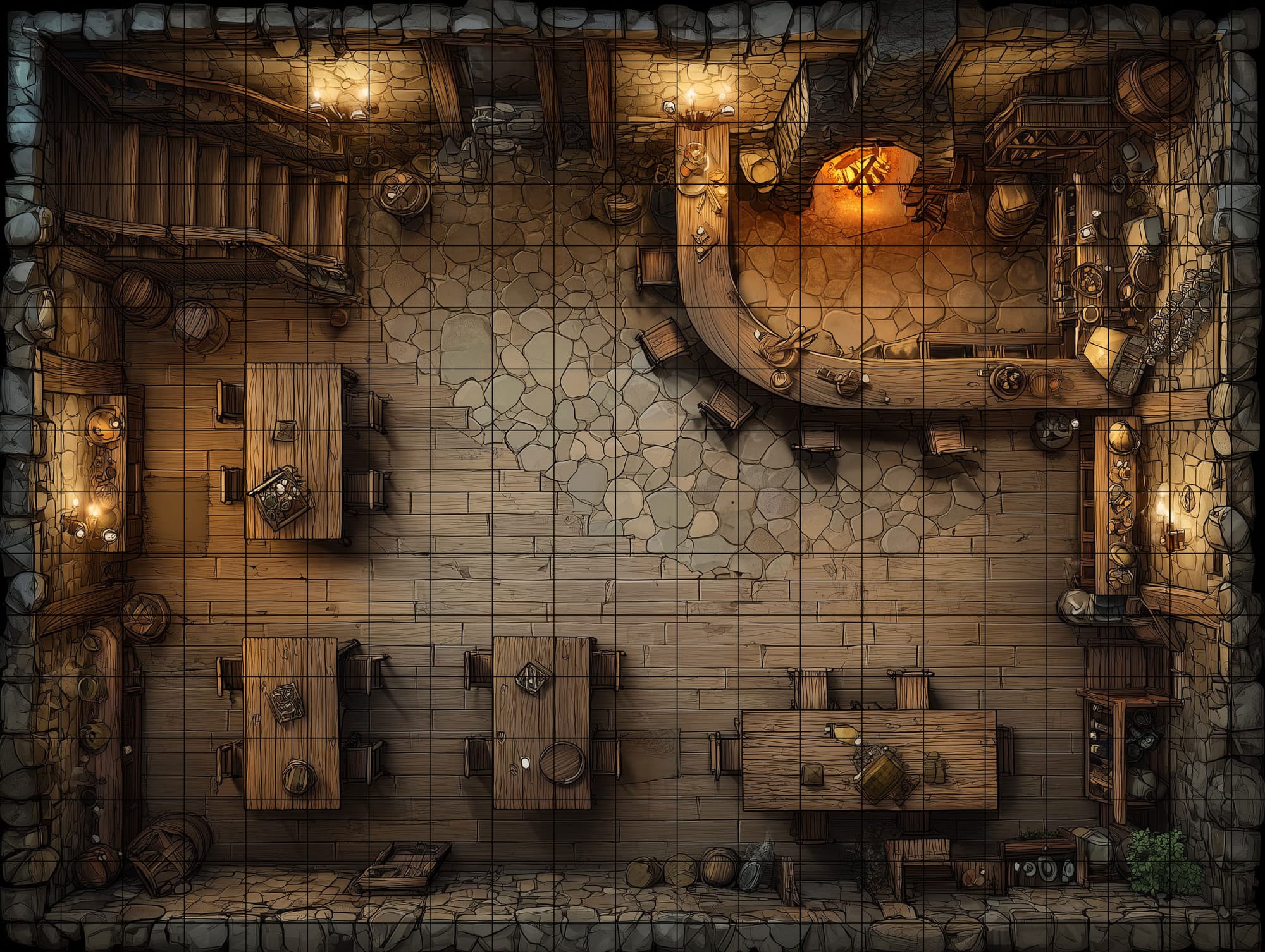 Along the north wall stretches a long bar of dark oak polished by constant use. Shelves behind it display rows of bottles and mugs arranged with quiet precision. Among them, tucked into an unlabeled spot at the far left, rests a short club that never strays far from Tomas Greywall’s reach. To the east, a large stone hearth crackles with fire, casting warm light across the room. At the south end, a staircase climbs toward three private rooms above and connects to a narrow back passage that leads quietly into the alleyways behind the building.
