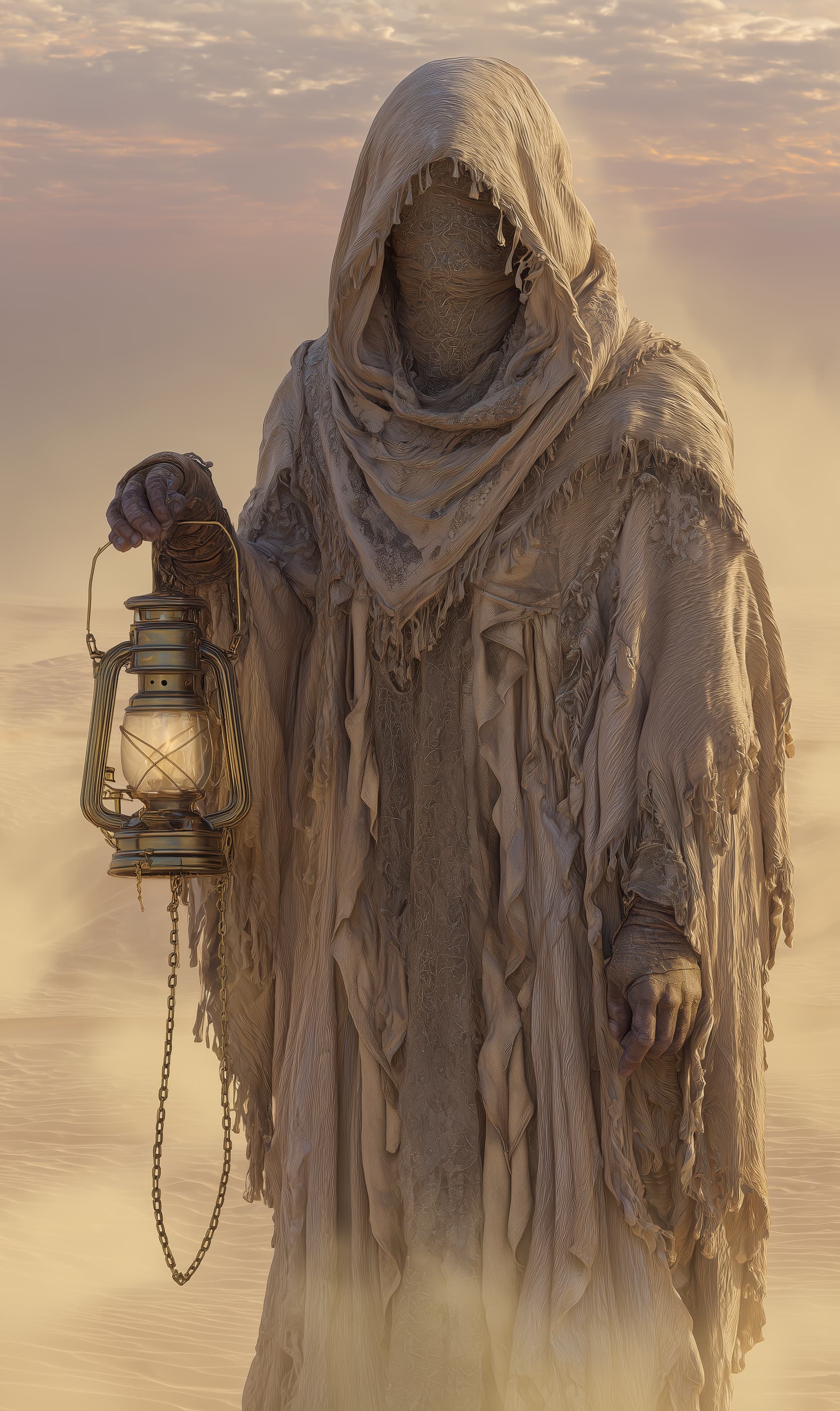 Appearance: The Lantern Seeker is entirely veiled in layered desert robes, their silhouette indistinct beneath sun-bleached cloth and ceremonial wrappings. No skin is visible; only gloved hands and a steady, unhurried gait. A curved bronze lantern hangs from a chain at their side, its glass panes fogged and its flame perpetually unlit — except in moments of great consequence. The air around them feels hushed, as if sound itself holds its breath. Their height, gait, and even build seem to subtly shift depending on the viewer’s expectation.