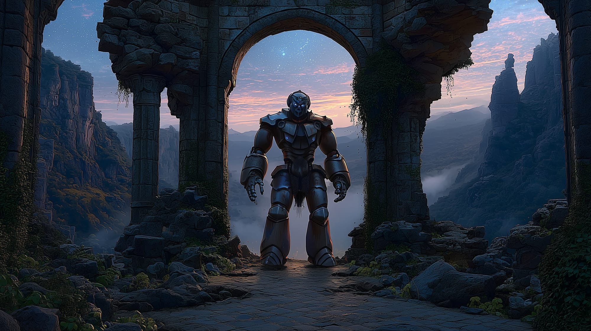 Created by the Forge-Priests of Tyrr-Rathak, the Vaultwarden was the greatest of the Iron Sentinels, its body folded over three days and three nights beneath divine flame. A soul fragment from a penitent war criminal was bound into its core — cursed to serve instead of burn.