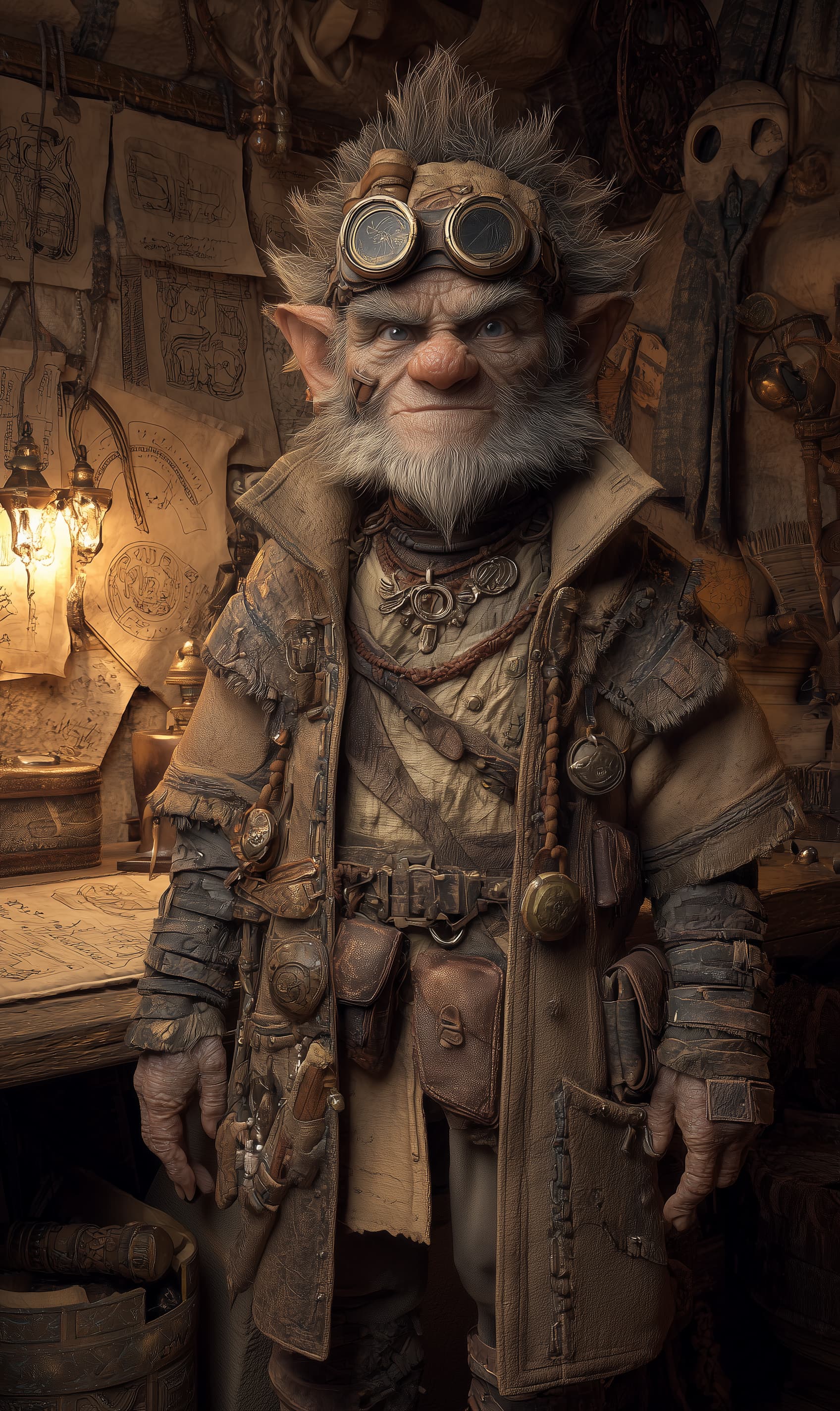 Appearance: Thornik is a compact, wiry gnome with a wild tuft of salt-and-pepper hair sprouting like a plume from beneath his cracked leather expedition cap. His face is weathered and smudged with soot, but his amber eyes gleam with manic intelligence behind thick, brass-framed goggles with magnification lenses that click into place. His patchwork coat is covered in stitched pockets and faded expedition tags from digs across Gaiathrae. Around his neck hangs a broken arcane symbol — the Shattered Sigil — which he discovered in a ruin and has obsessively studied ever since.