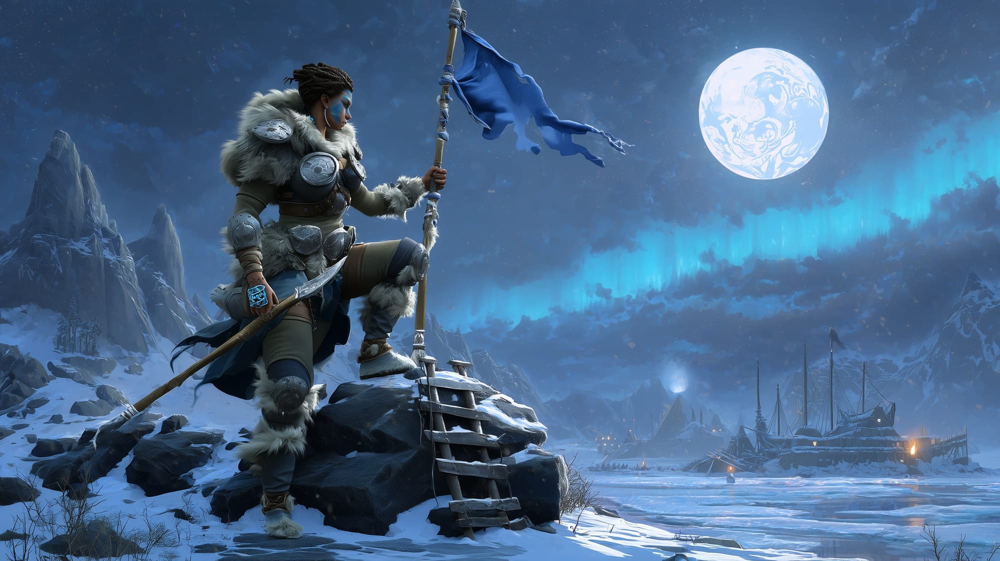 A hard-muscled human in her late twenties, wind-burned with a thin scar over one brow and blue ash war-paint across her nose and cheeks. Dark hair braided short beneath a fur-lined hood. She wears black-lacquer lamellar over layered seal-furs, ice-cleat crampons strapped to her boots, and a climbing harness loaded with bone wedges, pitons, blue rope, and a pennant staff capped by a frozen strip of dyed hide. Gear: a short spear, round shield painted with a blue handprint, two javelins, a signal horn, and a clay sleet gourd at her belt.