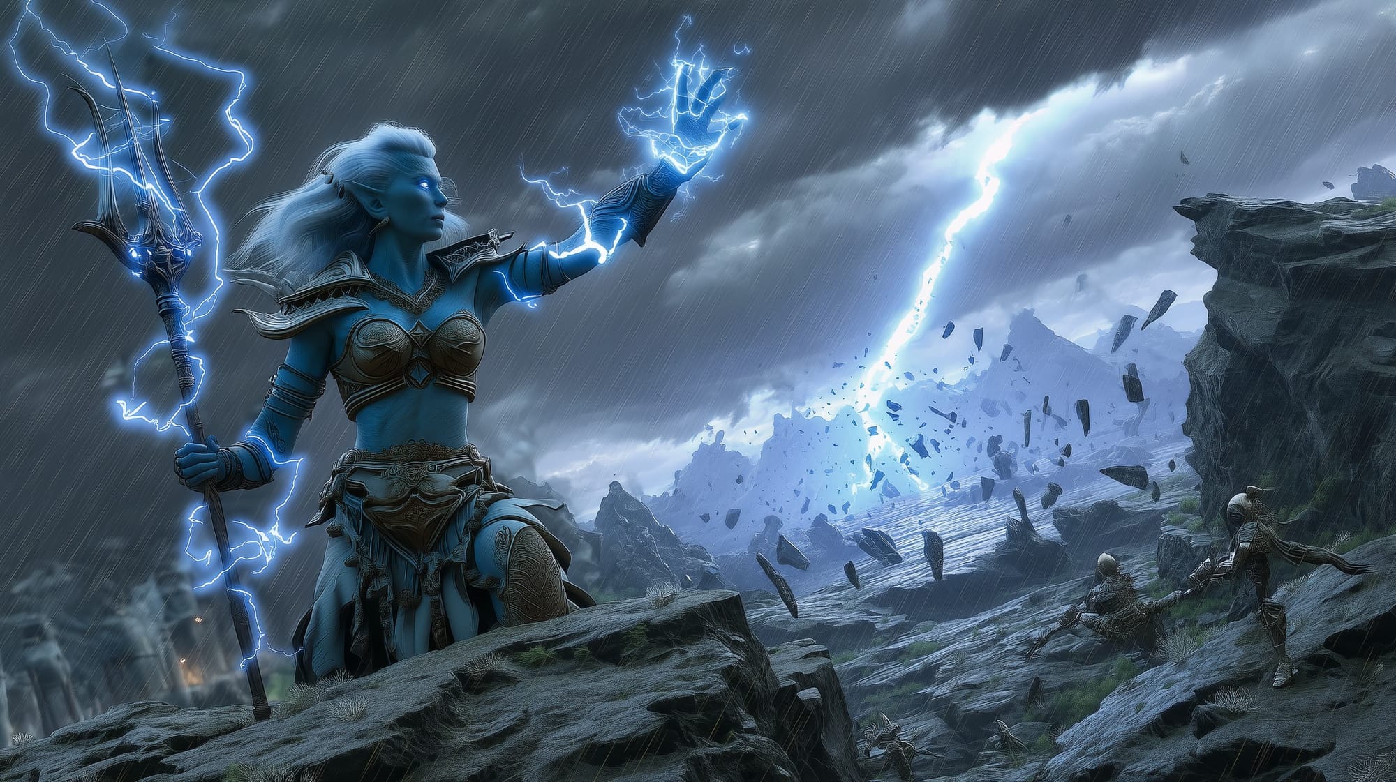 Vaelorith Stormcrest rules the upper Tempest Peaks as a sovereign without a court—a solitary warden who answers to lightning and tide rather than crown or council. Among the scattered Storm Giant clans that drift between the Shattered Coast's deepwater trenches and the cloud-laced summits of the Tempest Peaks, she holds the rank of Stormcaller Primarch, a title earned not through bloodline but through a feat of divination so precise it redirected a catastrophic gale away from three coastal settlements simultaneously. The lowland folk of Frosthold light a particular amber candle on the winter solstice—not in worship, but in acknowledgment: she watched, and she chose to act.