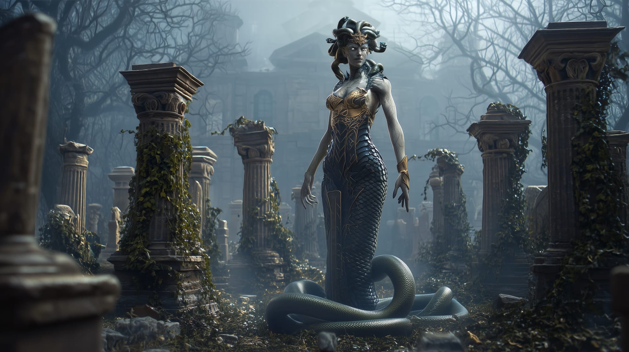 Transformed into a medusa, Vaessyra fled into ruin, expecting madness or rage to consume her. Instead, she found clarity. The curse did not strip her of justice—it made justice absolute.