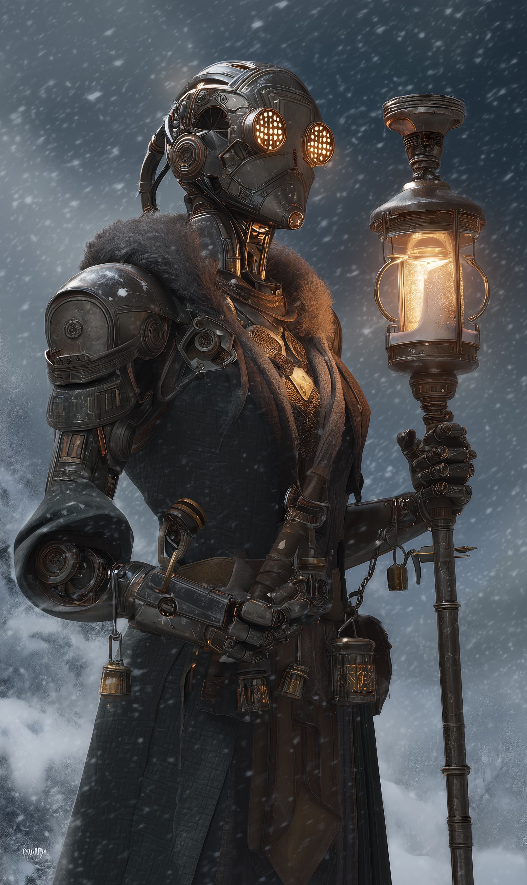 Appearance: A compact, graceful warforged of brushed ironwood and satin-brass plates, Vedra’s “face” is a smooth mask with etched numerals along the cheekline and a faint, warm glow behind latticework eye-shutters. A hooded, fur-lined lamplighter’s mantle sits over a leather apron bristling with tools: wick-picks, spring keys, tiny oil vials, and a folding tuning fork. A shuttered lantern (custom, with mirrored vanes) hangs from a telescoping staff; three small service bells ride her belt—first, second, and the deeper “third,” from which she takes her surname. Snow beads harmlessly on her oiled finish; a small, ever-ticking escapement turns at her throat like a heartbeat.