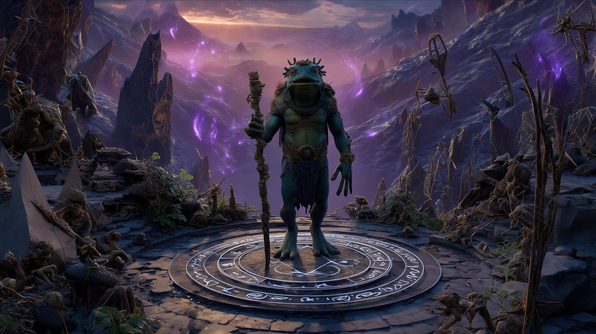 Velgarith is vine-wrapped and moss-covered, his sinewy, amphibian frame partially overtaken by strange fungal growths that shimmer with iridescent hues. His skin shifts in patterns like leaves in wind, and his claws appear gnarled like bark. His face is oddly serene, split by a permanent grin and eyes of glowing violet. Spores drift lazily in the air around him, trailing wherever he goes.