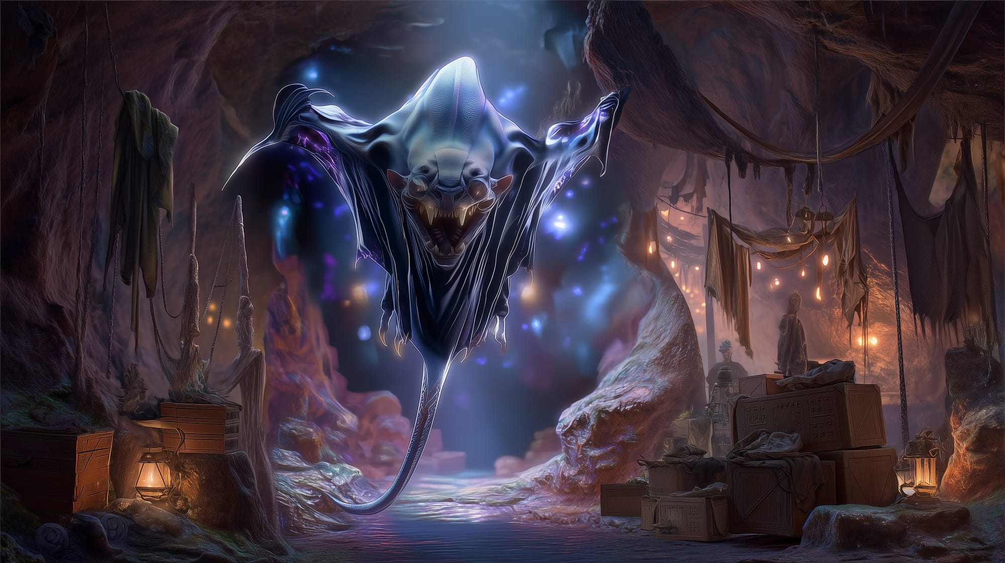 Veshra appears at first glance to be nothing more than a large, tattered black cloak draped over a stalactite or dangling from a hook of stone. The “cloth” is leathery, dark grey to inky black, with pale, veinlike streaks and ragged edges that sway with nonexistent drafts. When she spreads herself, you see the truth: a manta-like body with a rubbery underside, a maw of needle teeth in the center, and four faintly glowing eyes set in a skull-like bulge.