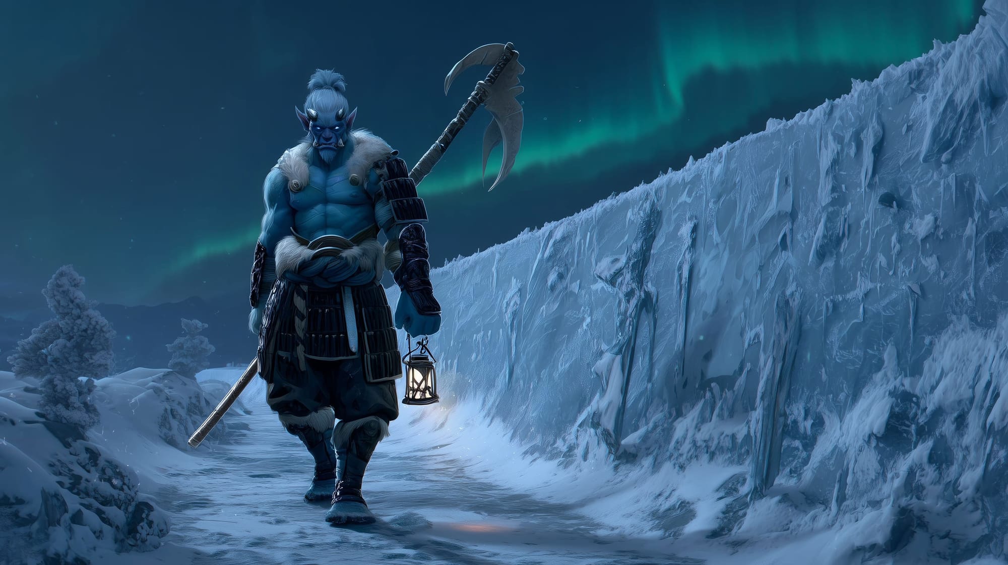 A towering blue-skinned giant-kin with tusked smile and ice-pale eyes. Whitish hair in a high knot, lacquered lamellar over furs, and a long black-lacquer lantern hanging at his hip that drinks light instead of giving it. His glaive’s blade is wave-curved and banded with frost runes. A thin line of rime trails each footstep. When he smiles, his breath smokes like ink spilled on snow.