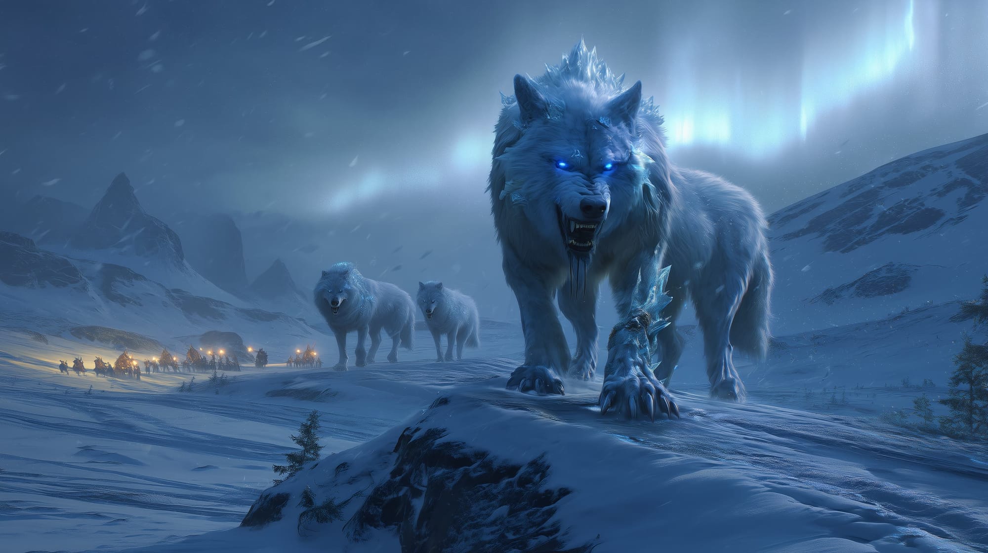 An enormous white wolf with ice-blue, reflective eyes and breath that fogs into glittering shards. Her coat is thick and slightly silvered along the spine; clots of frost cling to guard hairs. A jagged iron ring, once part of a giant’s kennel chain, still encircles her left foreleg above the dewclaw—polished by years of snow. Scars ladder her muzzle and one ear is torn. Up close, her teeth look like sculpted icicles, translucent at the tips.