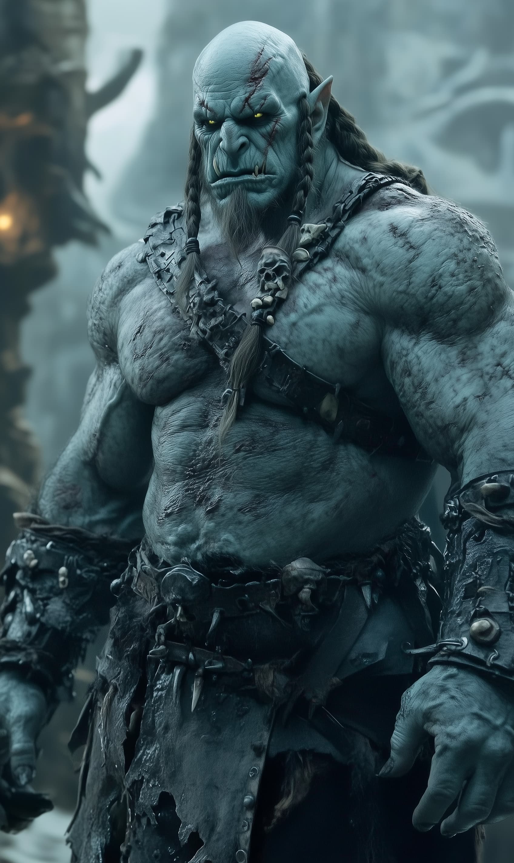 Appearance: Vorrak is a towering, broad-shouldered orc with a body that looks like it was carved from iron and fire. His gray-green skin is etched with deep battle scars, the most prominent being a blackened brand across his chest—the mark of a traitor or exile, burned into his flesh by his former warband. His eyes, once filled with fury, now hold a calculating, smoldering intensity.