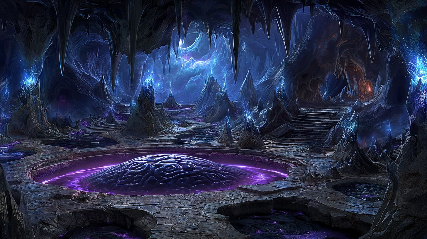 A forest of thick, rope-like tentacles extends from its underside, drifting slowly through the brine until they dart upward with terrifying speed to grasp anything that comes near the pool’s edge. Around the basin, the stone is fused with chitin and bone—skulls and vertebrae half-melted into the rock, and jagged psionic crystals jutting like teeth.