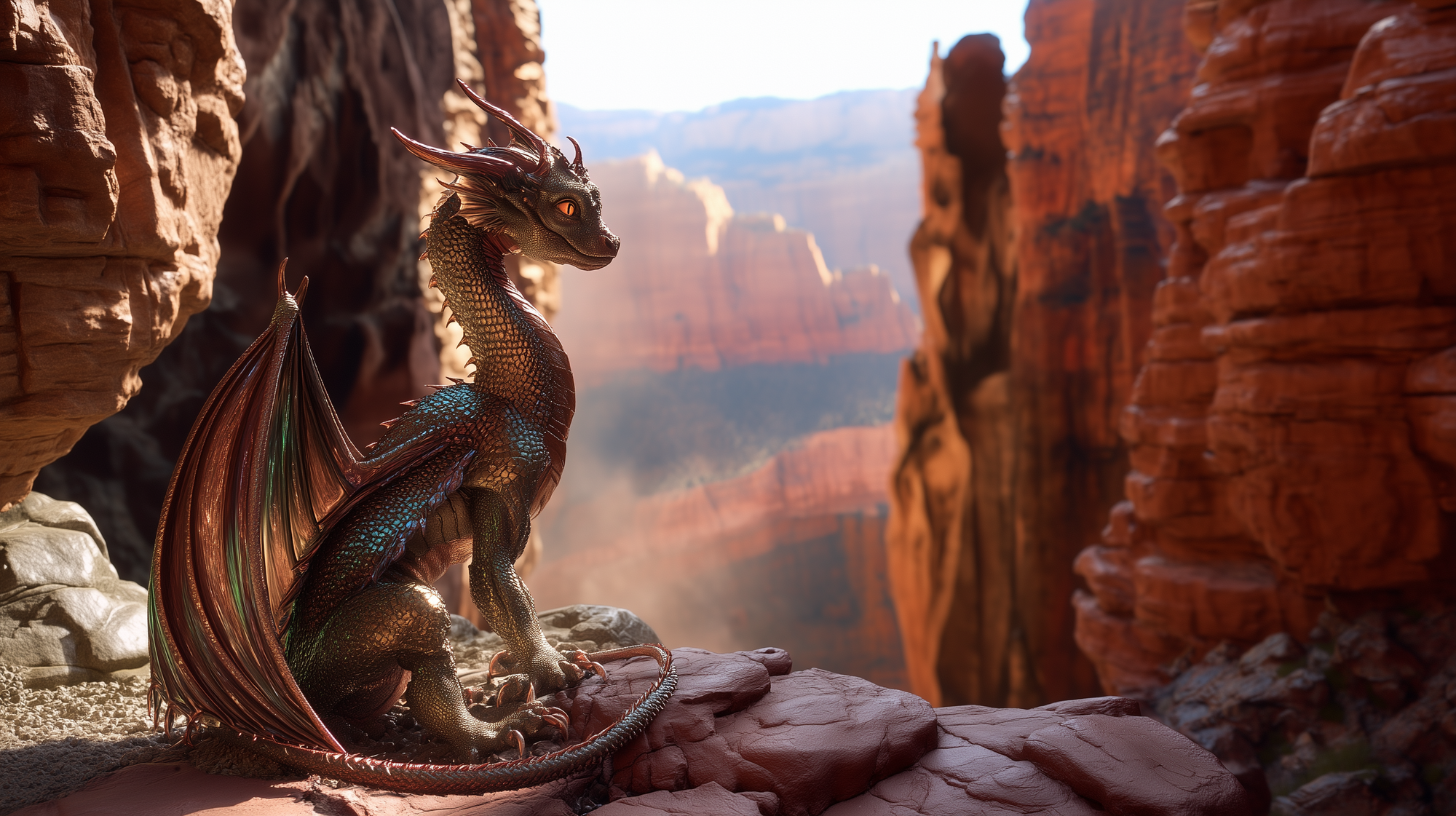 She smells of warm stone, dry canyon air, and something faintly metallic β like a coin left on sun-warmed rock.
