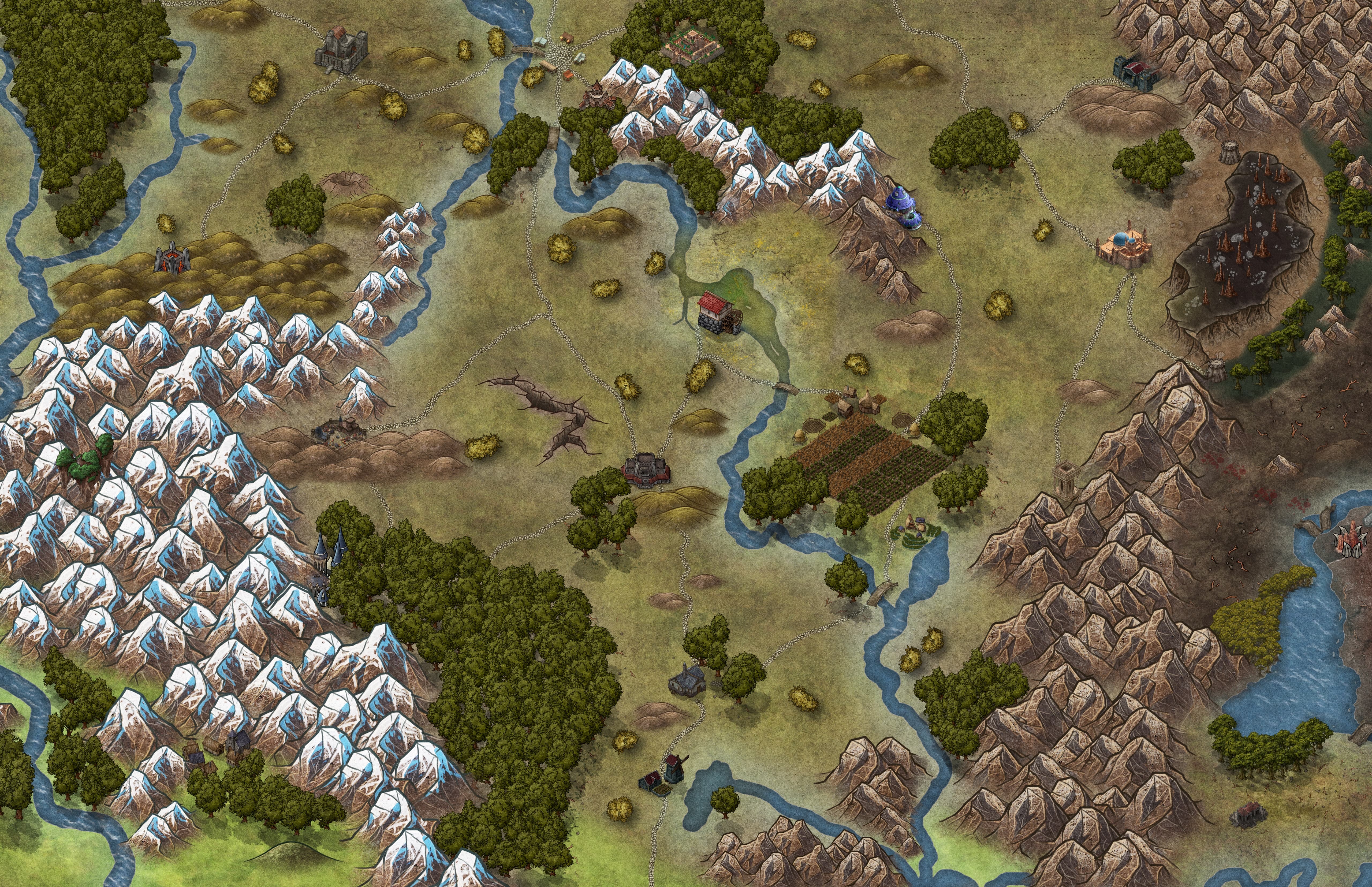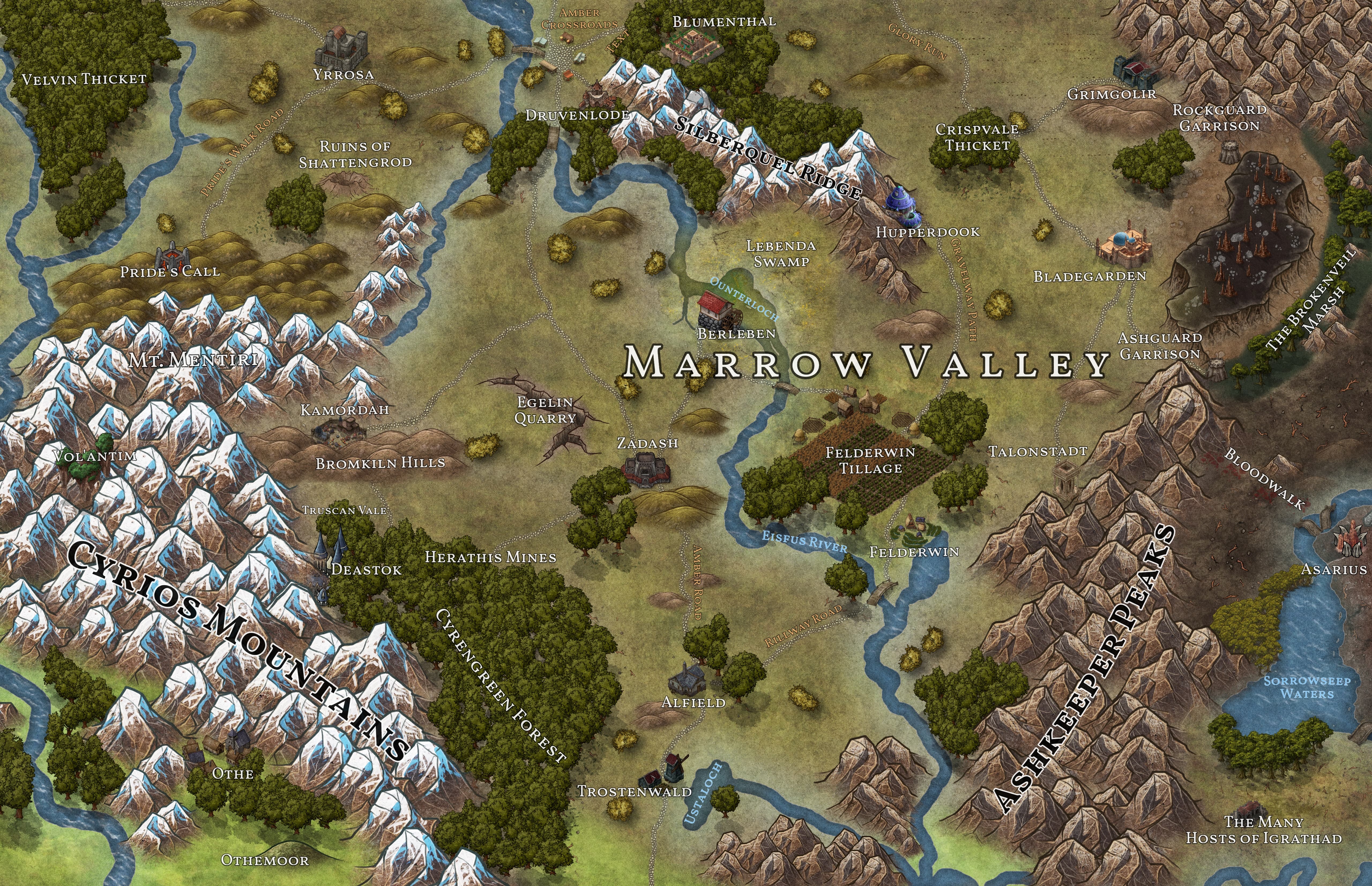 The Marrow Valley is a verdant expanse of green grasslands situated between the Ashkeeper Peaks and the Cyrios Mountains. This region is known for its beautiful farms and budding industries, attracting most of the travel and trade from outside the empire. The fields of grains and grasses expand into the lush forests and crystal lakes, creating a rural paradise in the south of Western Wynandir.