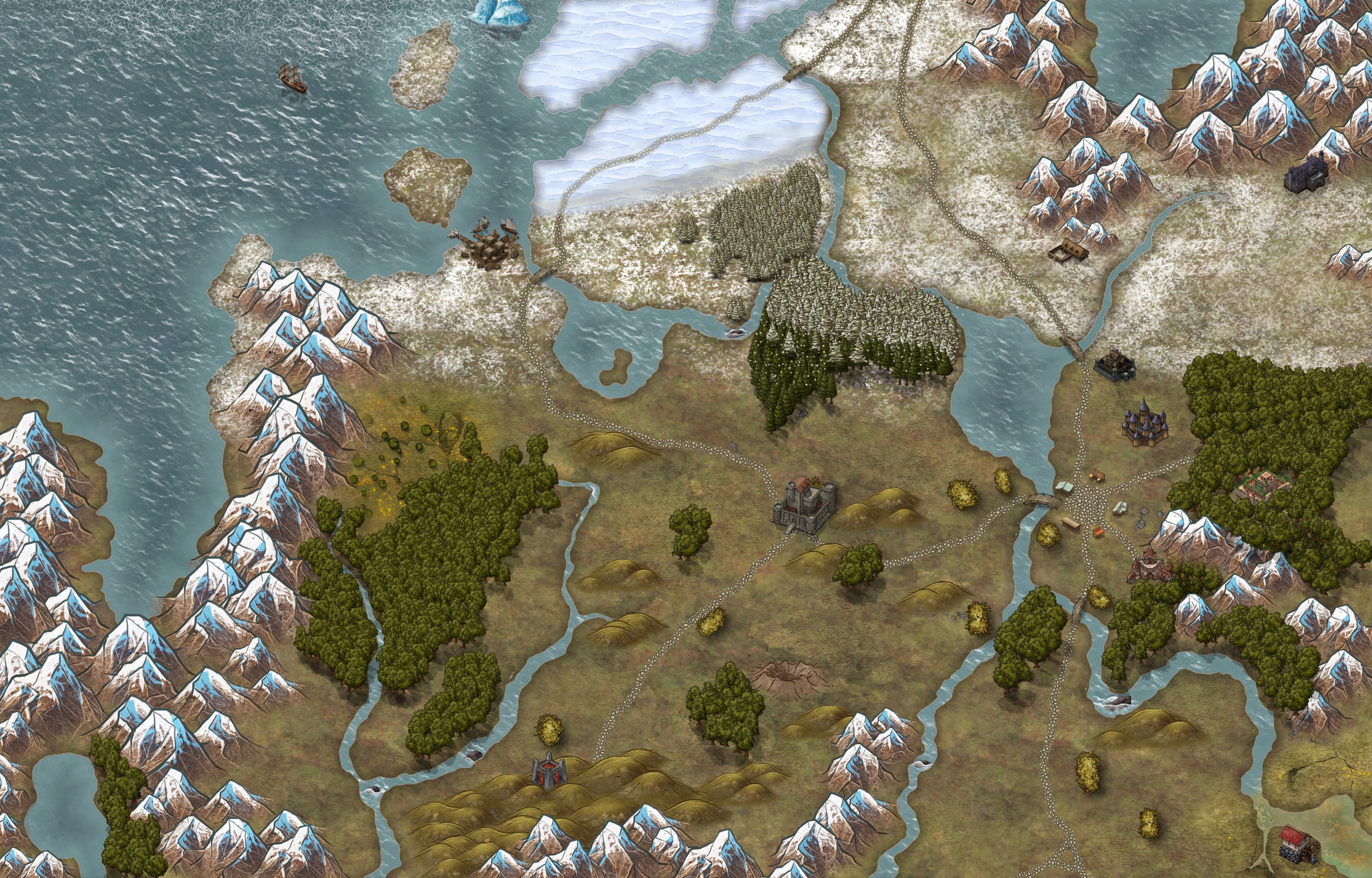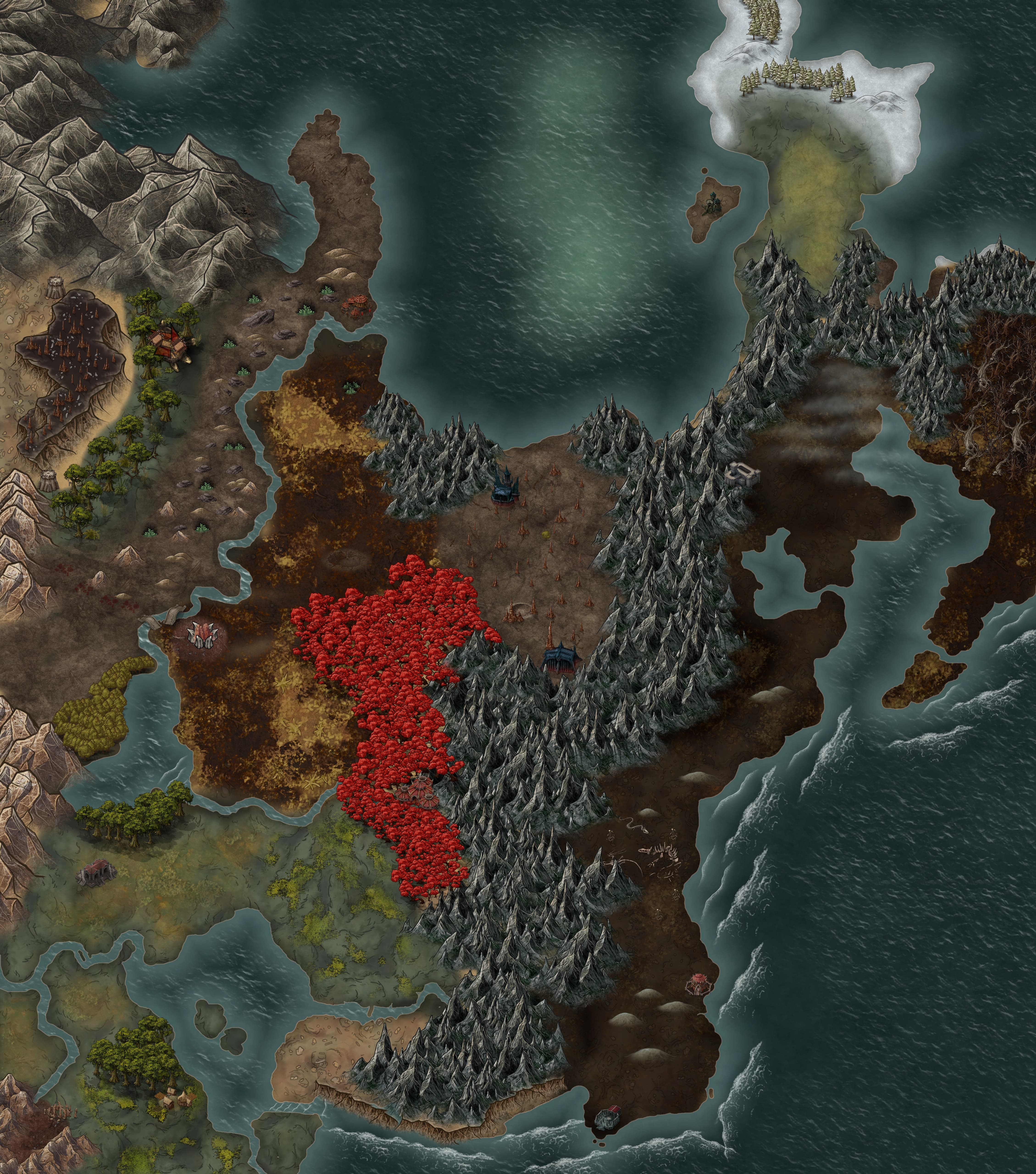 Dense, desiccated forests, rolling mountains, and icy tundra