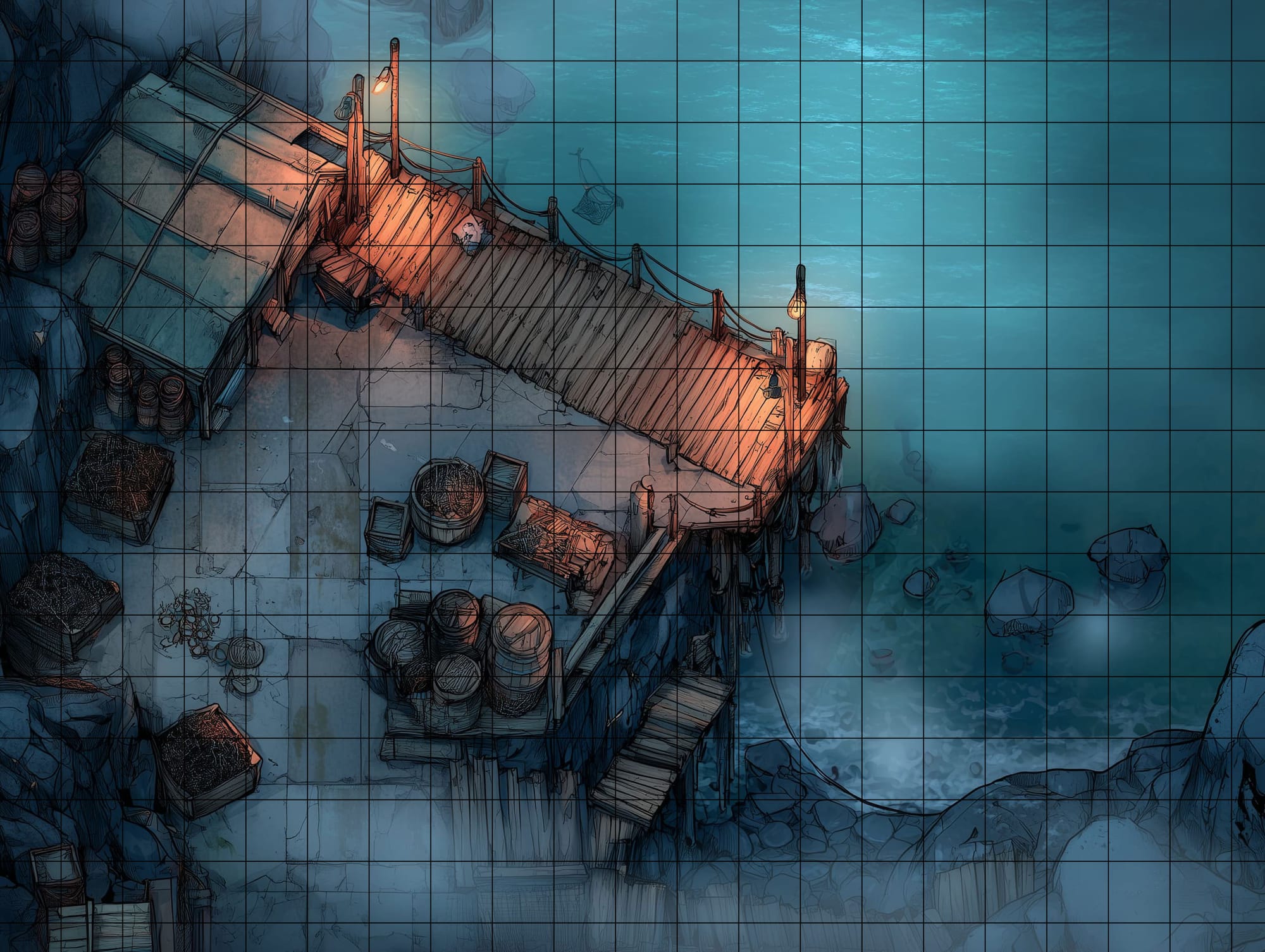 This map is built for low-visibility tension—ambushes, standoffs, and short, brutal fights where positioning matters because sightlines don’t. The uneven lantern spacing creates islands of illumination separated by shadowy gaps, rewarding stealth, sound-based tactics, and careful movement. The pier’s clutter provides frequent half cover, while the wet footing and open edge keep forced movement relevant even in a relatively small footprint.