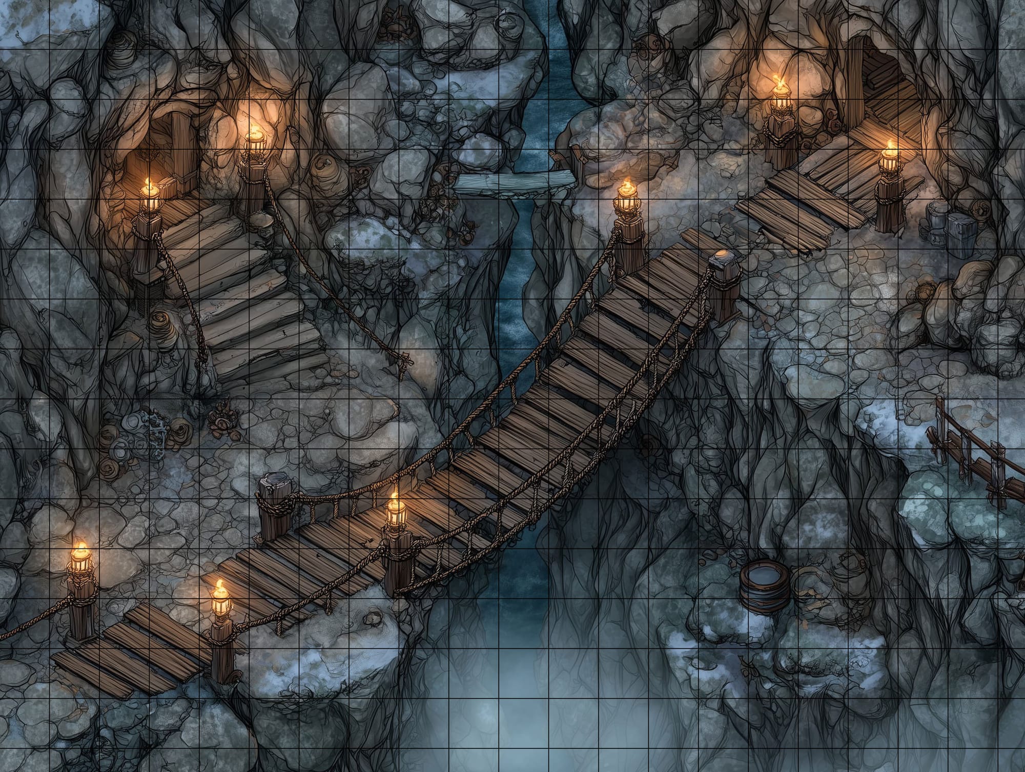 This map is built for high-tension traversal encounters—ambushes, chases, and duels where footing matters as much as tactics. The narrow lanes and rope rail boundaries keep combat compressed and readable, making every position choice feel consequential. The bridge span creates an immediate choke point objective: hold it, cross it, cut it, or use it as bait. With wet stone as difficult terrain, movement becomes deliberate, and sudden gusts can turn routine turns into dramatic saves near the edge.