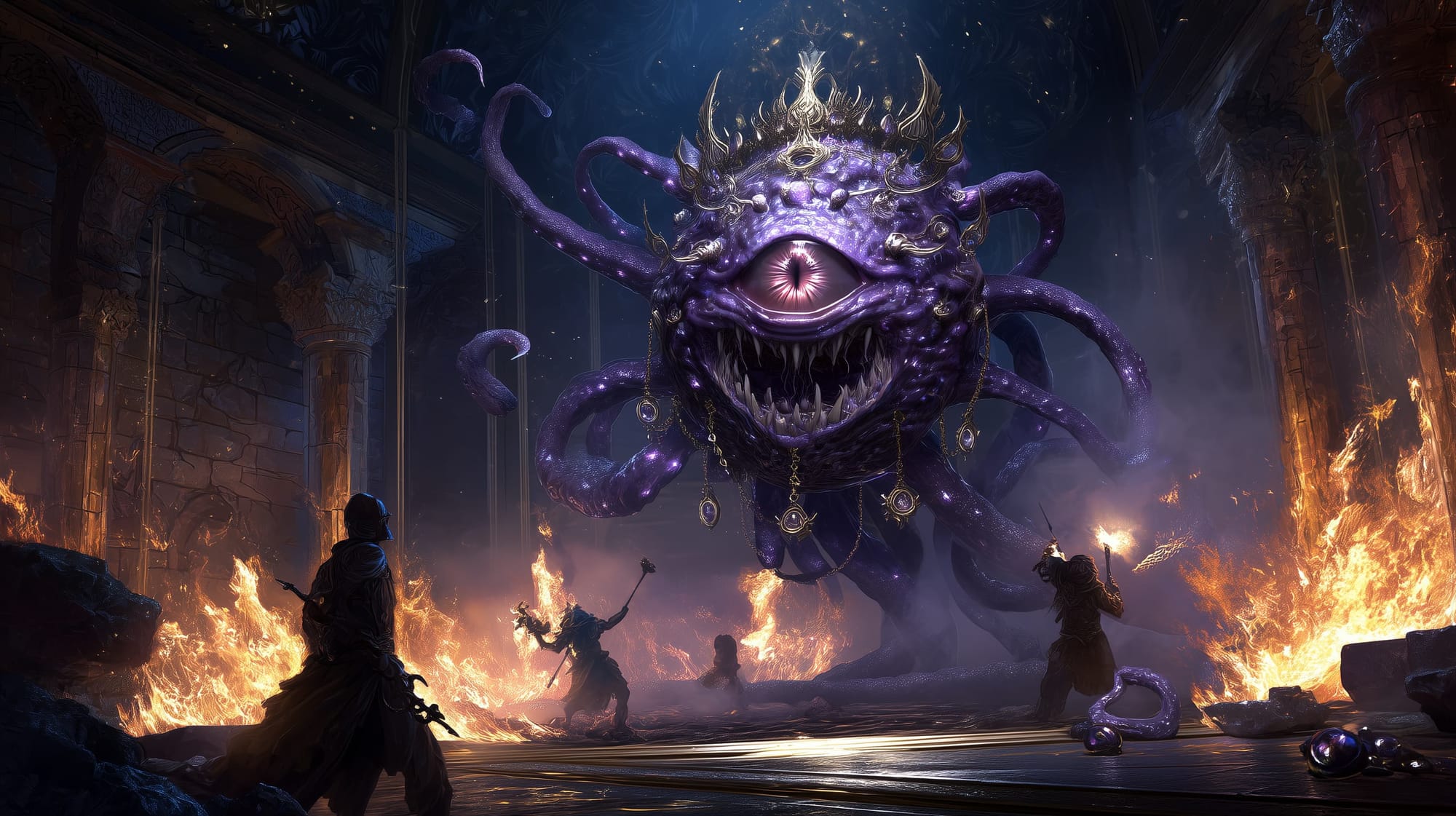 Beneath the obsidian spires of the Nevermoors, whispers speak of a tyrant who sees all. Xaltheris, a Beholder whose paranoia has turned the flooded caverns into a fortress of optical illusions and deadly traps, rules from a chamber whose walls are lined with petrified “traitors.”