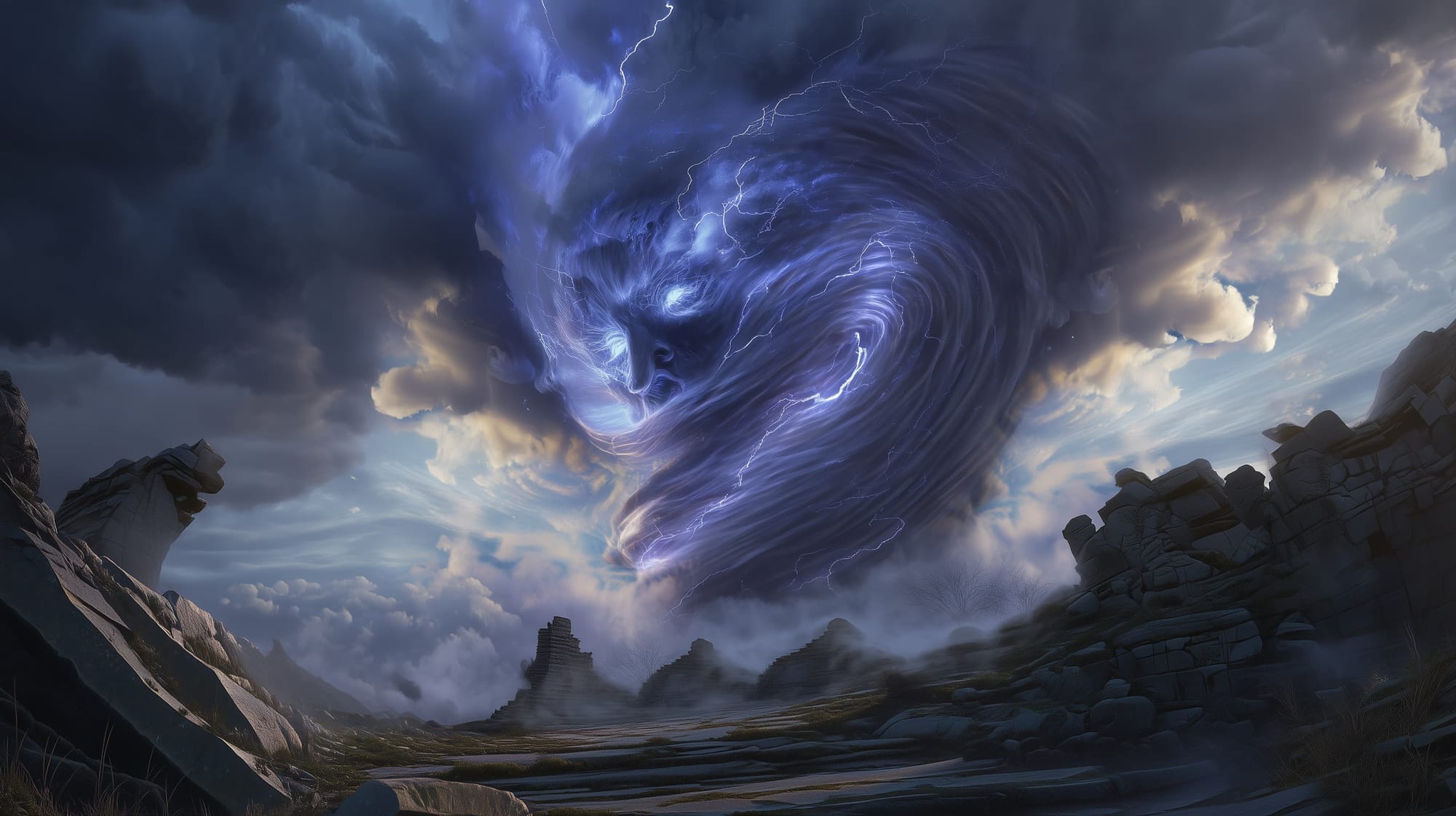 Lightning crawls beneath its surface like veins beneath skin, illuminating the storm from within rather than bursting outward. Ruins around it are not smashed apart but peeled, eroded, and worn down, as though centuries of weather were forced into moments. When Zephyrix moves, the sky bends with it.